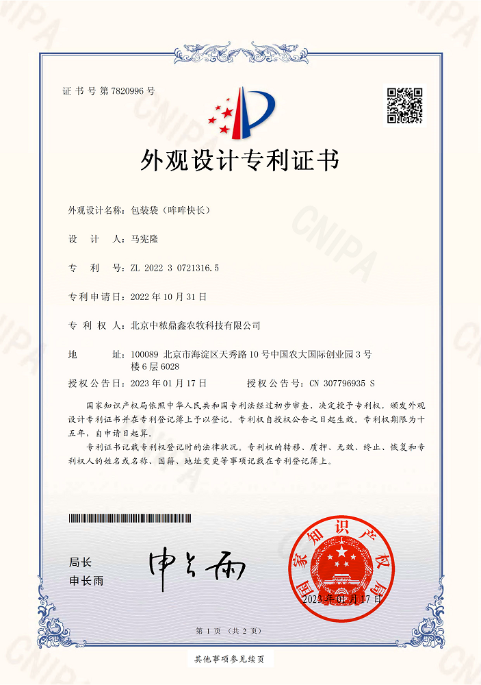 哞哞快長外觀設計專利證書
